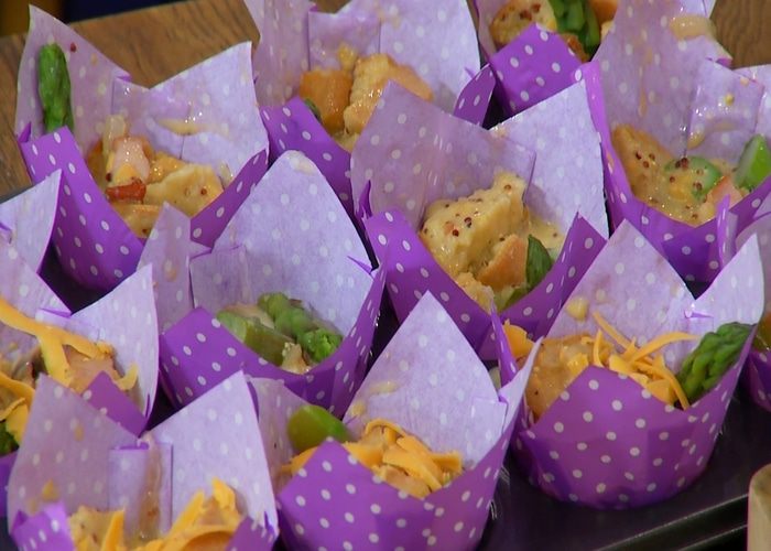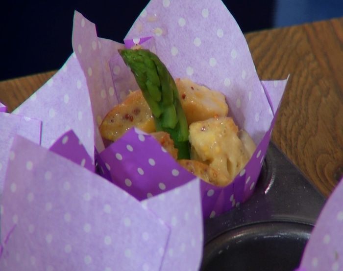 В формы для маффинов поместить бумажные вкладыши, разложить хлебную массу, воткнуть в центр хвостики спаржи и посыпать оставшимся сыром.