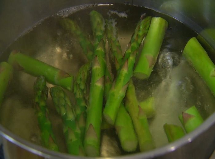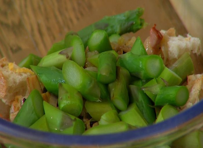 Бланшированную спаржу нарезать небольшими кусочками (хвостики оставить для украшения).