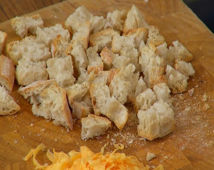 Сухой хлеб нарезать небольшими кубиками.