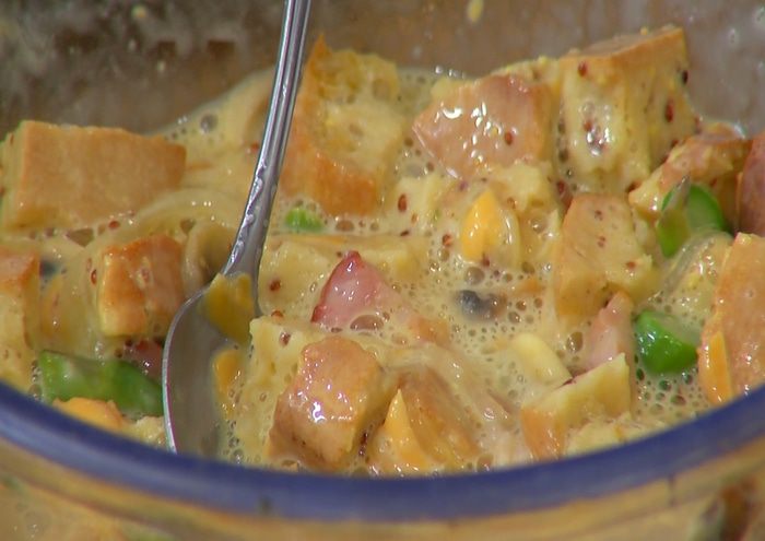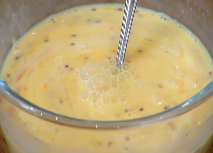 Яйца соединить с молоком и горчицей, посолить, поперчить и перемешать.