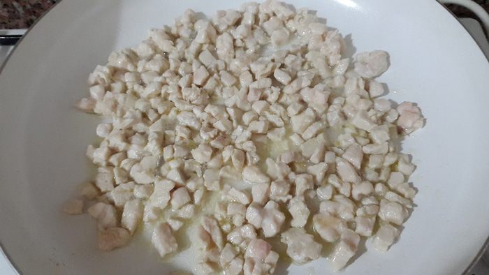 Куриную грудку мелко нарезать и обжарить на ложке оливкового масла.