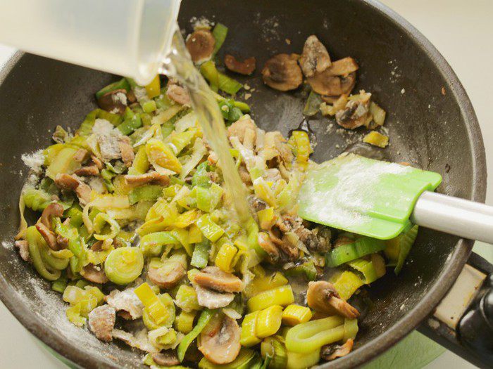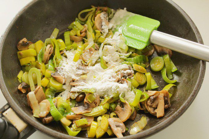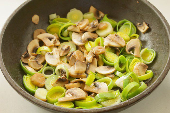 В сковороду, где готовились фрикадельки, выложить порезанные лук и грибы, немного пассеровать их.