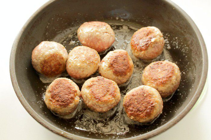 Из фарша сформовать небольшие фрикадельки. Обжарить фрикадельки на разогретом растительном масле. Готовые фрикадельки отложить в сторону.