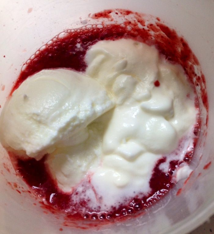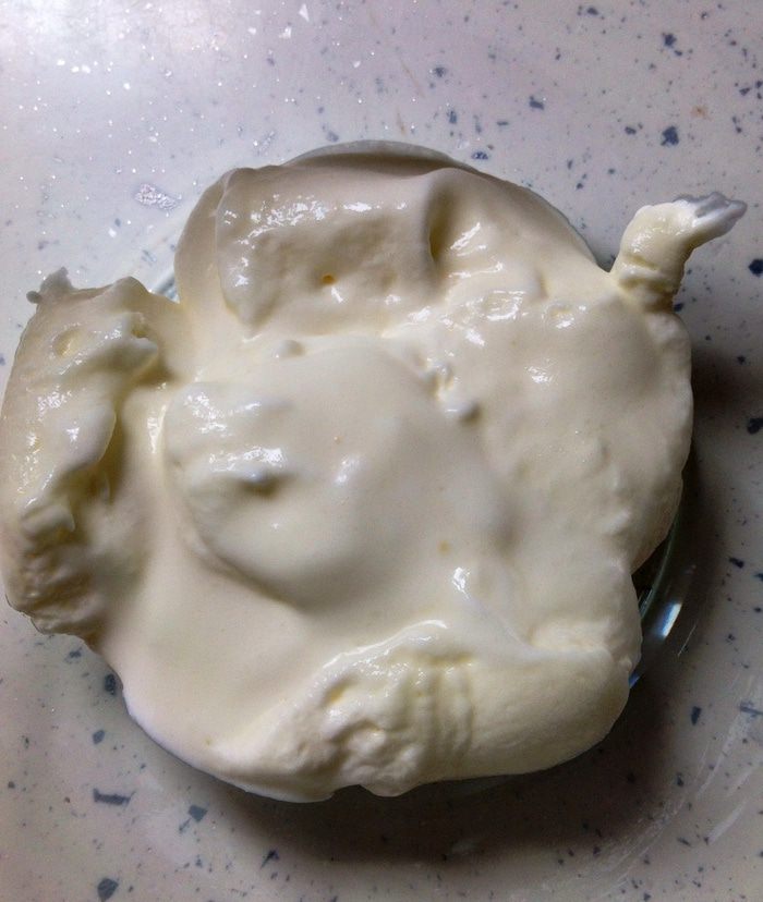 ** Если вы хотите заморозить десерт в контейнере, тогда оставьте мороженое в той же посуде, в которой взбивали и уберите также в морозильную камеру. Минут через 40 достаньте и взбейте хорошо миксером, тщательно разбивая замерзшие кусочки. Снова уберите в морозильную камеру. Проделайте так еще раз. Потом еще раз взбейте хорошо, перелейте в контейнер с крышкой и уберите в заморозку на несколько часов или до утра. Готовое мороженое можно сервировать по вашему желанию.