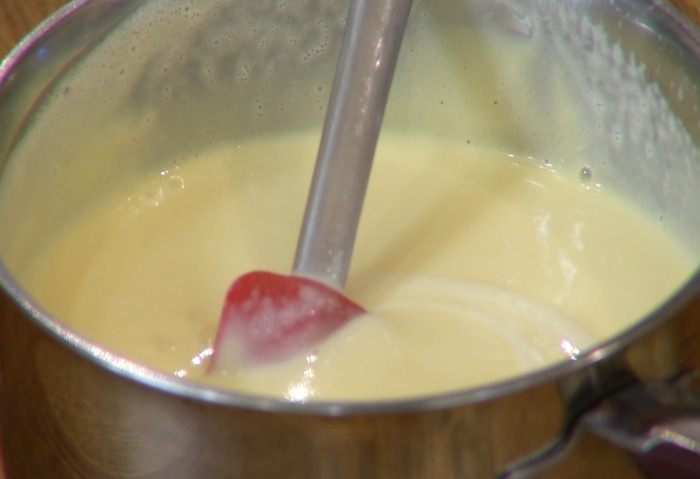 Продолжая взбивать, небольшими порциями влить половину горячего молока, затем перелить яично-молочную смесь в кастрюлю с оставшимся молоком и поместить ее на огонь. Непрерывно помешивая, уваривать крем 5–7 минут на медленном огне, чтобы он загустел.