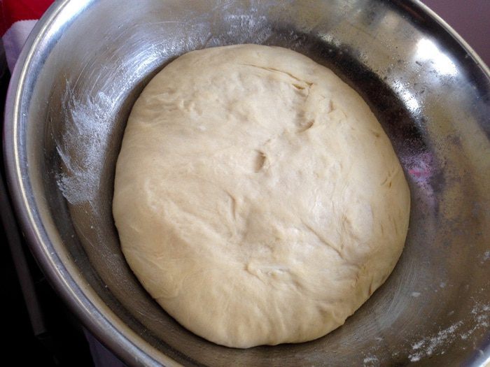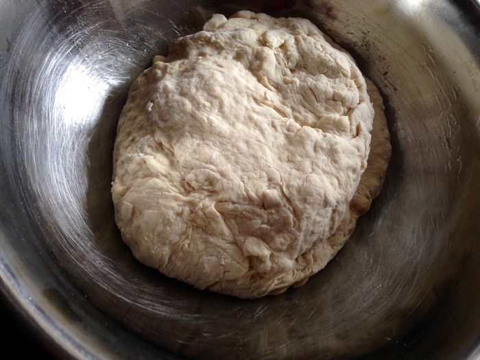 Затем вымешать тесто опять в течении 10 минут. Накрыть полотенцем и дать постоять 10 минут. Повторить данную процедуру еще 2 раза. В конечном результате дать тесту постоять в тепле 45 минут.