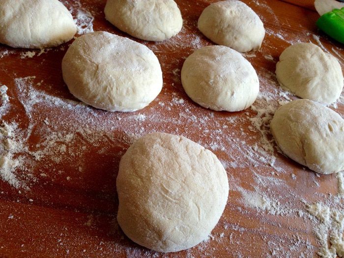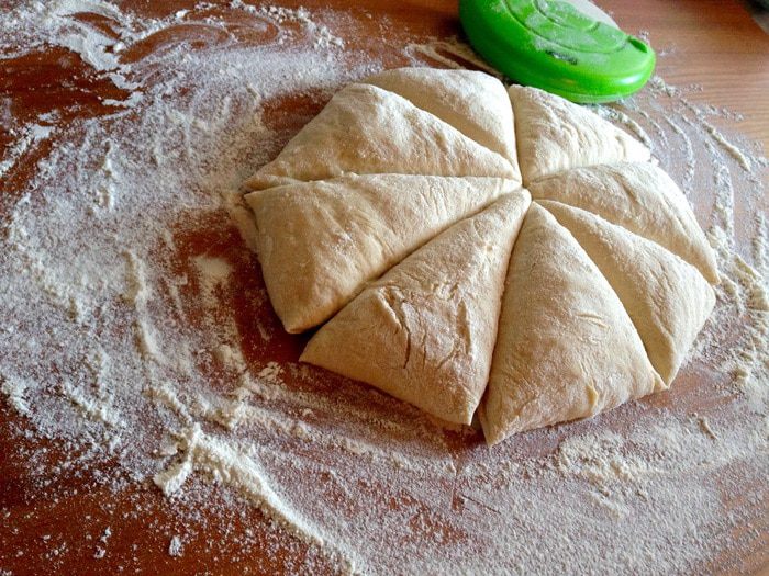 Выложить тесто на густо присыпанную мукой рабочую поверхность, разделить на 8 частей.