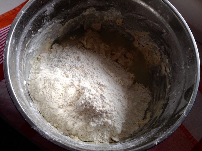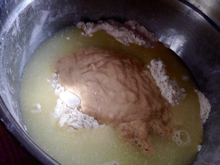 Убирать с большой миски половину муки, а к остальной части добавить 200 мл сыворотки и опару. Перемешать.