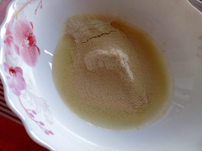 Смешать сухие дрожжи с цельнозерновой мукой и 100 мл сыворотки. Накрыть полотенцем и оставить на 30 минут.
