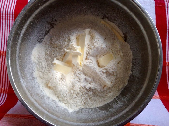 В миске смешать белую муку (просеять) с солью, добавить сливочное масло и растереть в крошку.