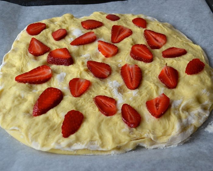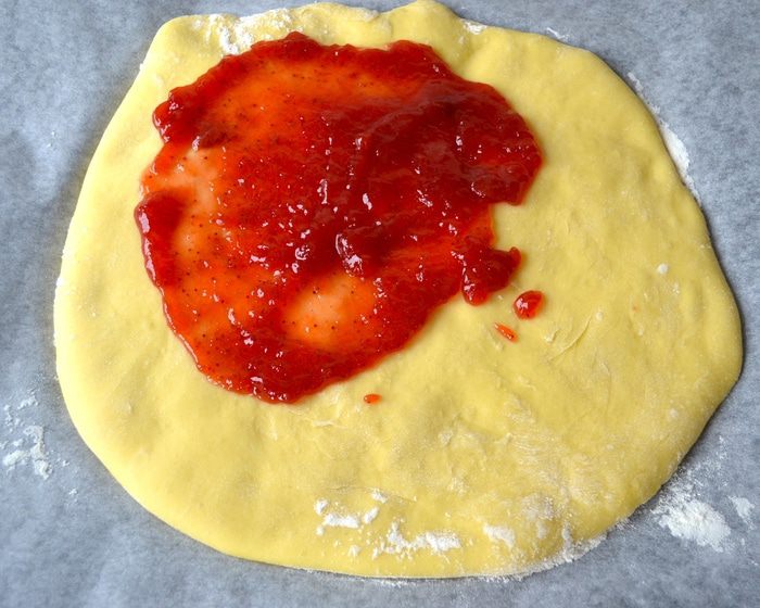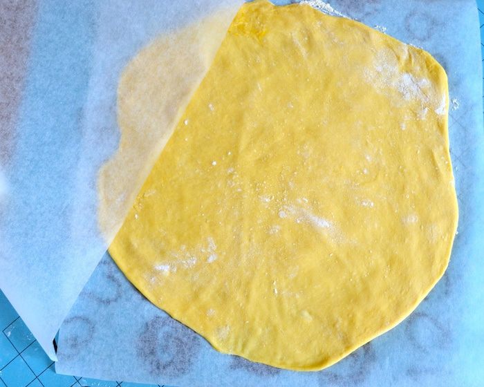 Теперь возьмите второй лист пекарской бумаги, слегка смажьте его растительным маслом и накройте им раскатанное теста. Перенесите на противень. Теперь точно также поступите с оставшейся половиной теста! Важно, чтобы второй раскатанный пласт теста был на хорошо присыпанным мукой пергаменте, тогда вы потом без проблем его удалите! Второй круг из теста тоже накройте листом пергамента и оставьте всё на 1 час для расстойки.