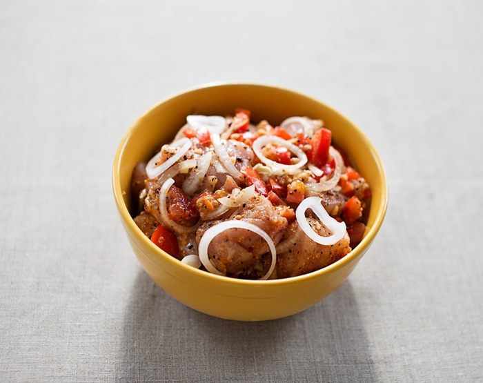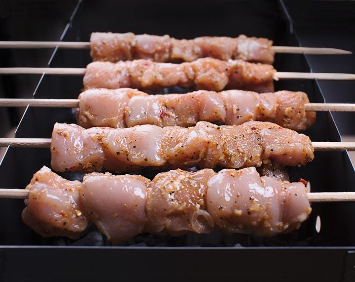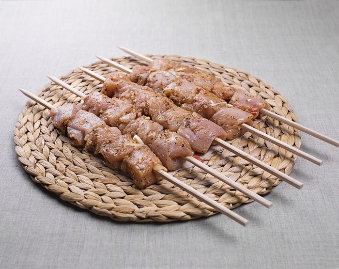 Нанизываем мясо на шампуры. Я себе не изменяю – готовлю только на деревянных шампурах. Не спроста, кстати, некоторое время назад, во время приготовления шашлыка, я решила его попробовать на предмет готовности и не просто надрезать или оторвать кусочек, а с шампура. Еще неделю ходила в роли Джокера на одну сторону с полоской от краешка рта и в бок по щеке – ожоги же так украшают женщину (надеюсь табличку «сарказм» доставать не стоит).