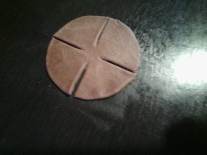 Раскатать тонко тесто, вырезать круги 6-7 см диаметр, сделать надрез крестом, но не до конца.