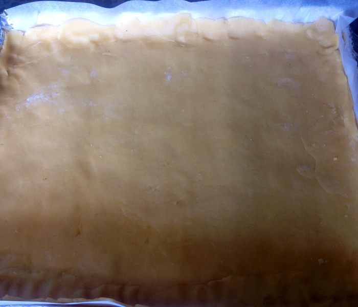 Выкатываем пласт толщиной 1 см, не больше, и выкладываем его на противень. У меня противень маленький, потому что пекла на даче (у меня вышло 2 противня), у вас выйдет один большой стандартный.