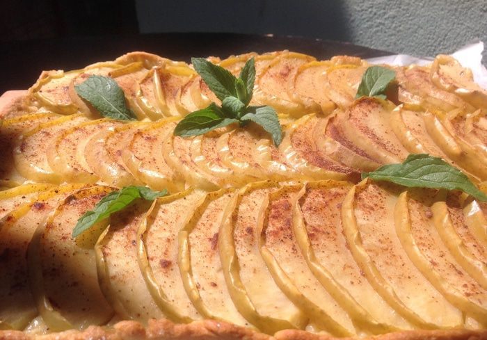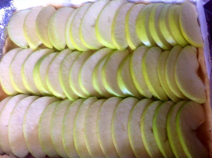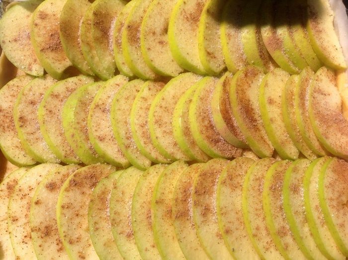 Этот пирог может быть открытым, а может быть с решеткой из полочек теста. Я делала открытый с яблоками и корицей.