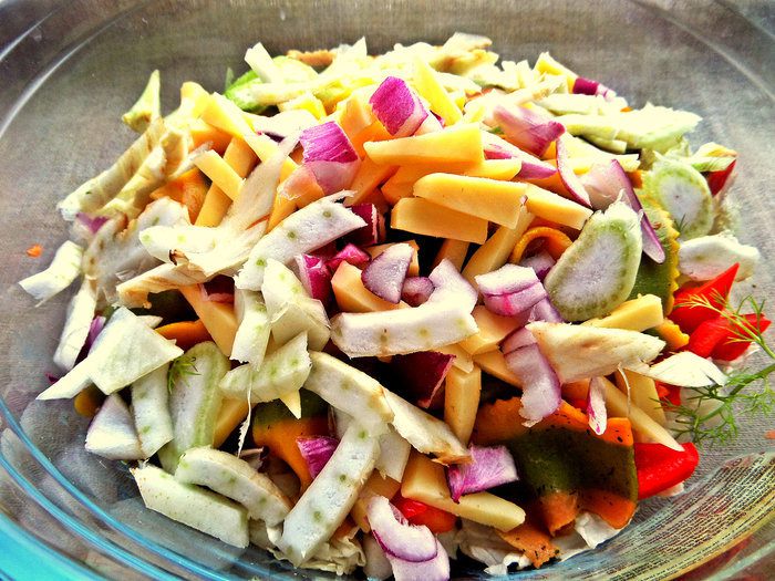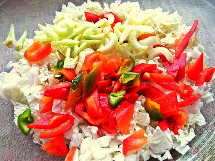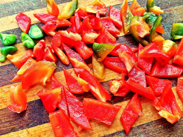 Болгарский перец помыть, почистить, нарезать на кубики.
