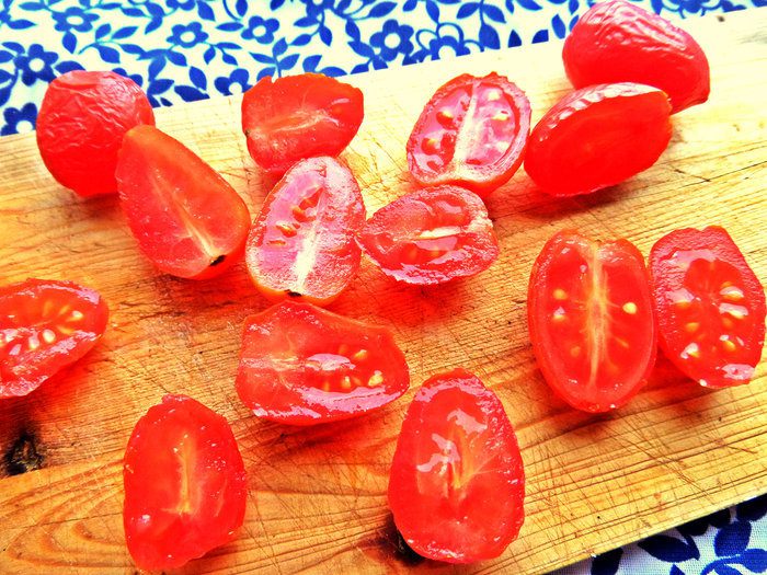 Крошечные помидорки (они даже меньше черри, но выращены у моей знакомой) разрежем пополам.