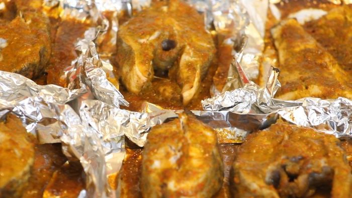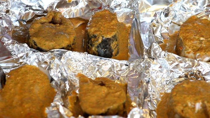 Кладем каждый стейк в мисочку из фольги и полностью покрываем перечным соусом.