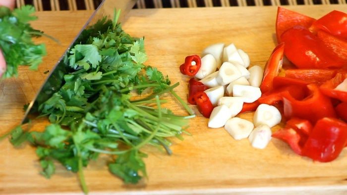 Режем крупно чеснок, чили перец, сладкий перец, и кинзу.