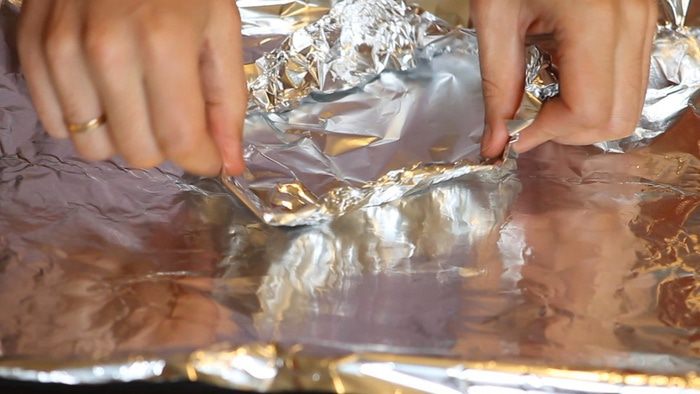 Застилаем противень фольгой. Формируем из отрезков фольги мисочки по размеру нарезанных стейков трески.