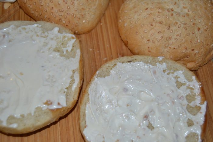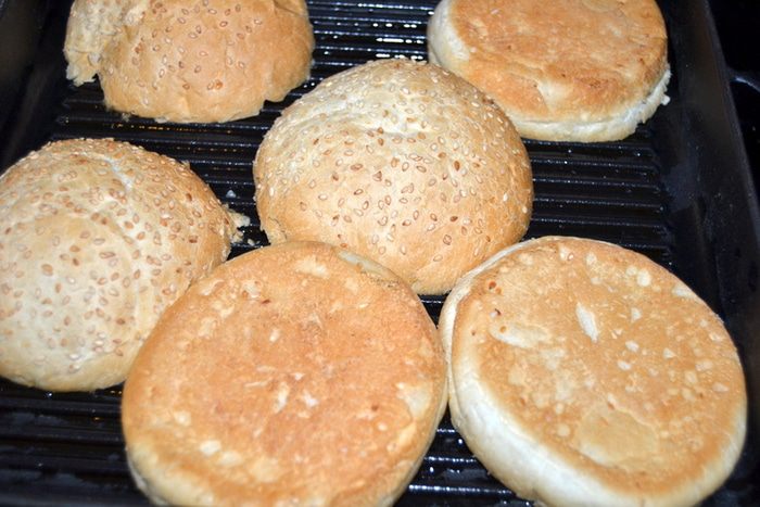 Булочки разрезать пополам и подсушить на горячей сковороде без масла.