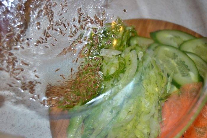 Овощи помять руками и уложить в миску с маринадом. Перемешать и убрать в холодильник.