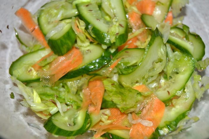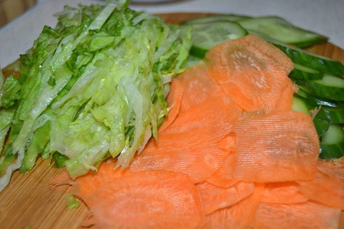Огурец нарезать тонкими ломтиками, салат нашинковать (салат можно заменить на пекинскую капусту), морковь нарезать тонкими пластинами, удобно это сделать овощечисткой.
