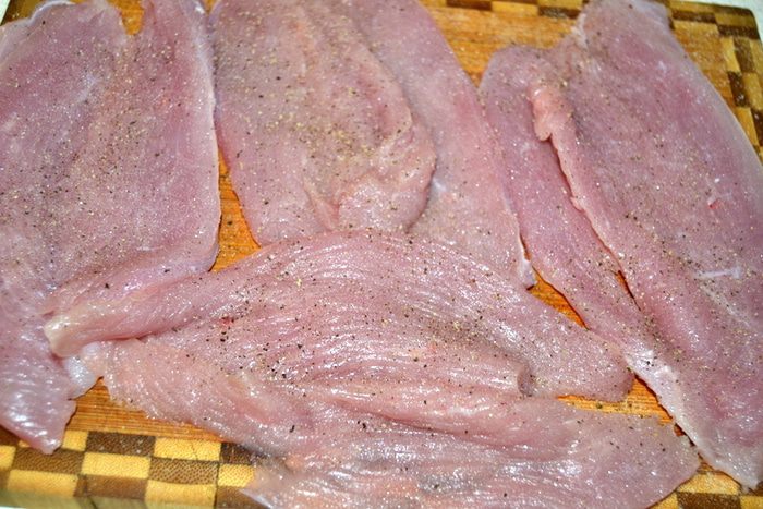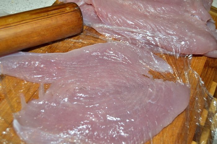 Филе индейки (можно взять куриное) накрываем пищевой пленкой и скалкой раскатываем, получается тонкий пласт мяса.