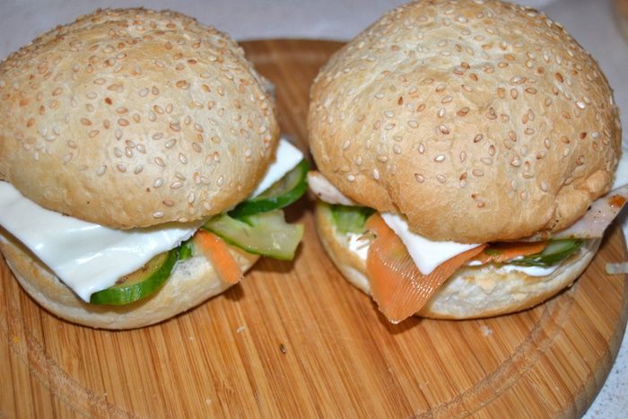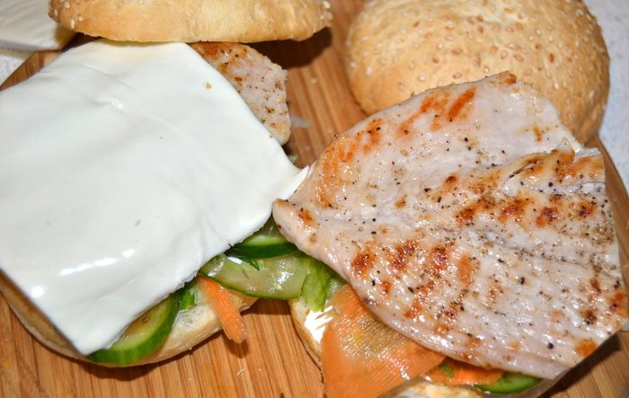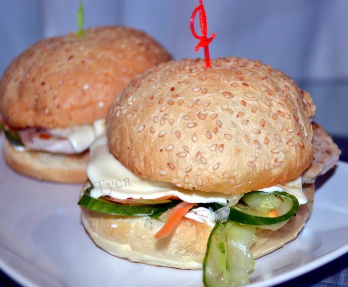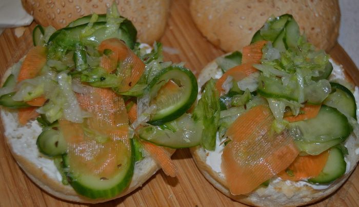 Очень вкусные и сочные гамбургеры. Вкус всех ингредиентов настолько сбалансирован, что ни добавить, ни убавить. Быстро замаринованные овощи, филе при возможности можно обжарить на открытом огне, сделать самим или купить хорошие булочки. Попробовав, вы будете делать их снова и снова! Я даже сфотографировать толком не могла, за спиной были голодные стоны мужа... По ходу рецепта я скажу, что на что можно заменить.
