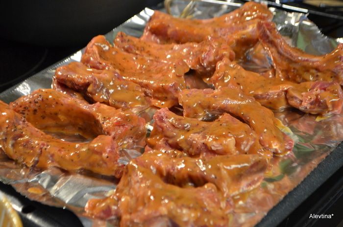 Смазать ребрышки в соусе, посолить и поперчить.