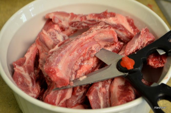 Свиные ребрышки порезать кухонными ножницами на отдельные ребрышки.