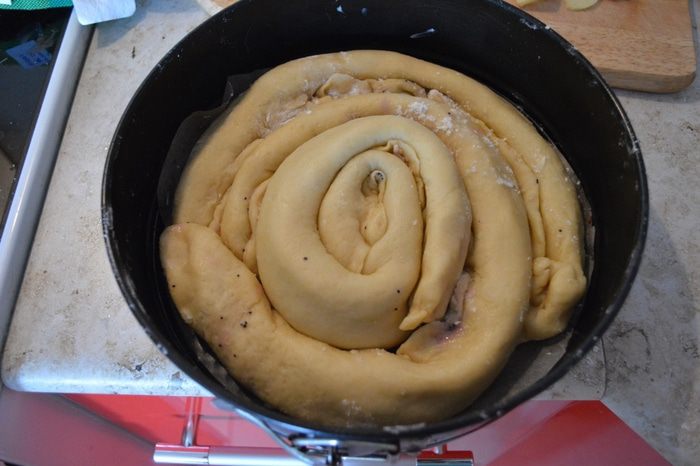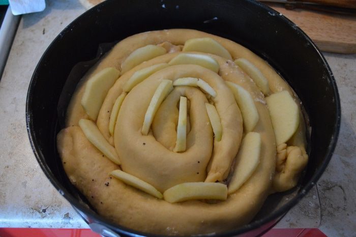 Вложить кусочки яблок между рулетами. Накрыть пирог полотенцем и поставить на расстойку на 20-30 минут.