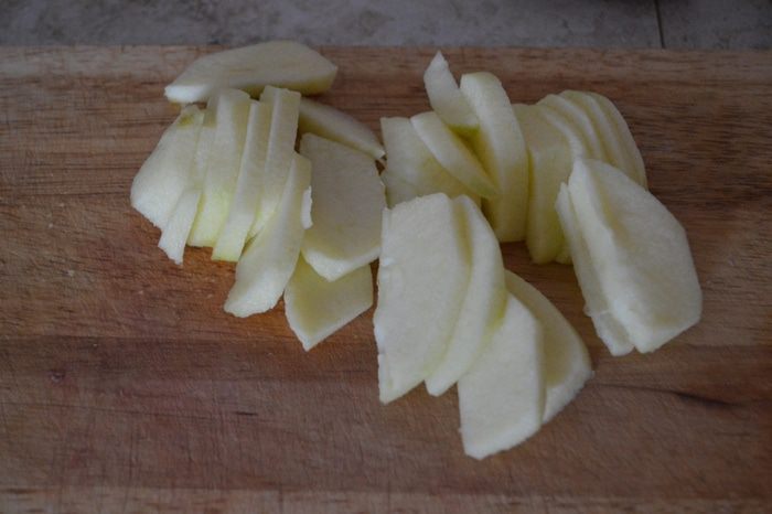 Яблоко очистить, нарезать тонкими пластинками.