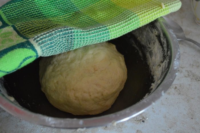 Замешиваем нежное, приятное на ощупь тесто. Оно не липнет к рукам. Накрываем полотенцем и ставим тесто подходить в теплом месте, чтобы оно увеличилось в два раза. У меня это заняло где-то час времени.