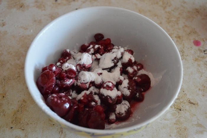 Вишню присыпать крахмалом (стакан у меня традиционный граненый, объемом 220-230 грамм, если под завязку).