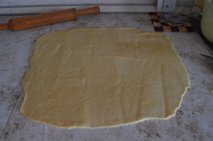 Готовое тесто раскатать в пласт толщиной 5-7 мм.