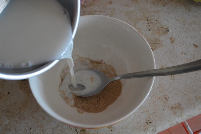 Готовим опару: для этого дрожжи заливаем теплым молоком, тщательно размешиваем. Добавляем 2 ст. л. муки и 1 ст. л. сахара. Перемешиваем и накрываем опару. Поставить в теплое место, пока не поднимется