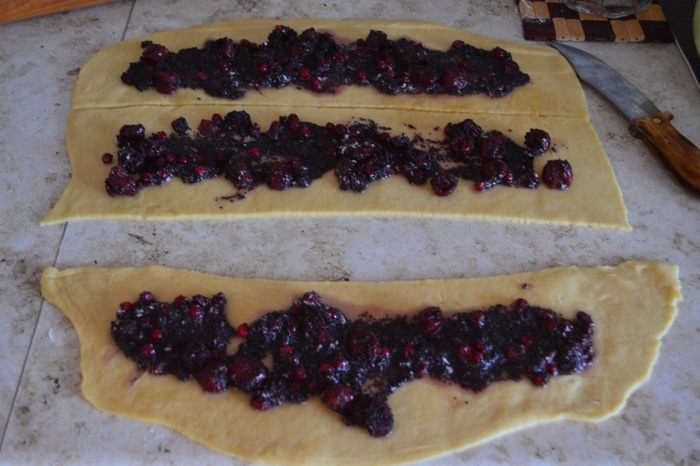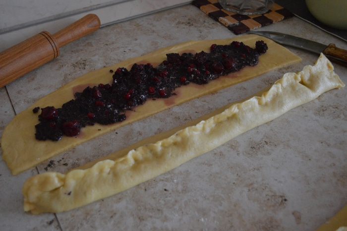 Разрезать на три прямоугольника и равномерно выложить начинку.