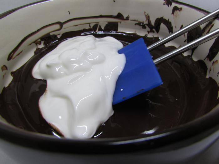 Шоколад снять с огня. Добавить сметану, хорошо перемешать и дать слегка остыть.