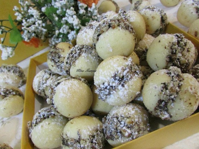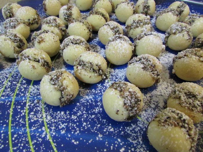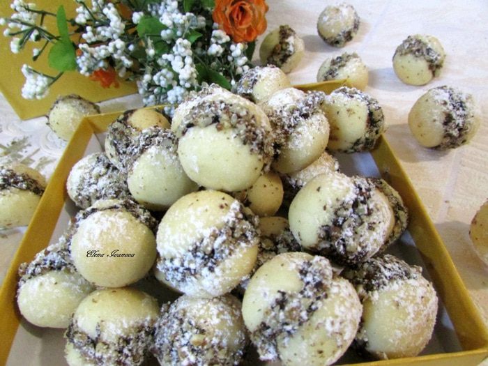 Из теста формовать маленькие шарики (у меня каждый шарик по 5 грамм). Выложить на противень, застеленный пекарской бумагой. Отправить в разогретую духовку (160 градусов). Выпекать 12 минут (я выпекала 18). Печенье должно быть светлым.