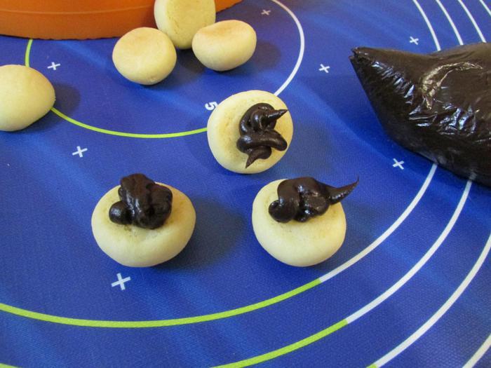 Шоколадный крем выложить в кондитерский мешок, сделать маленький надрез. Выдавить немного крема на половинки печенюшек.