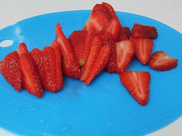Клубнику и нектарин нарезать пластинами. Выложить на ломтики багета.
