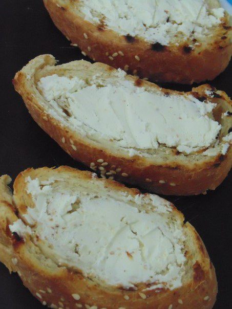 Ломтики багета подрумянить на сковороде-гриль (в духовке, на решетке, в тостере).