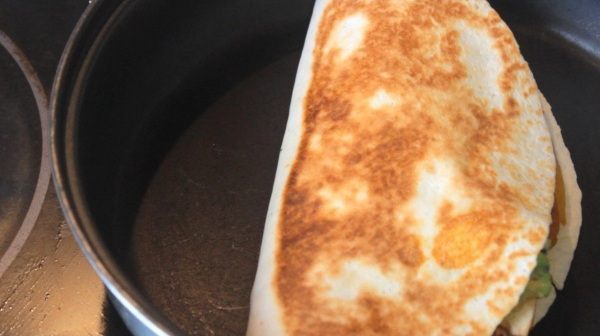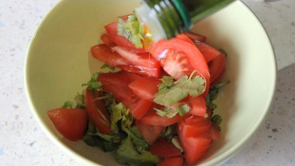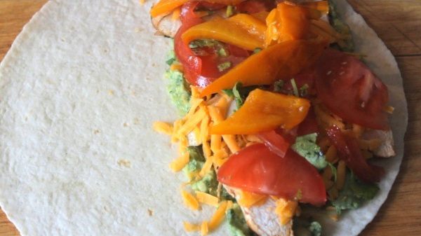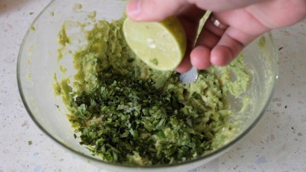 Далее делаем соус гуакамоле. Мякоть авокадо давим в пюре, добавляем туда мелко нарезанную кинзу и чили перец, сок половины лайма. Давим из 3-х зубчиков чеснока пюре и также добавляем к авокадо. Солим, перчим. Перемешиваем. Гуакамоле готов.