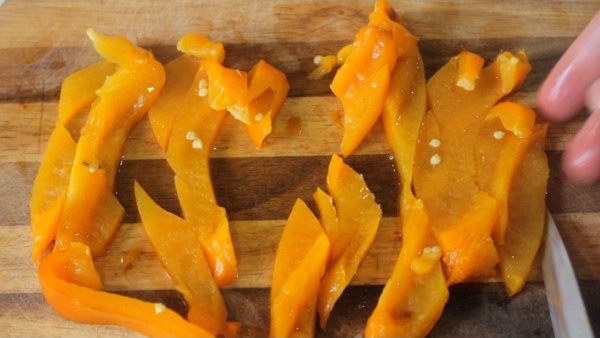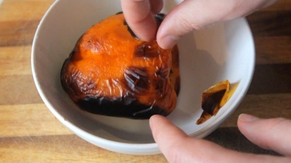 Запекаем сладкий перец под грилем до черноты. Далее кладем его в тарелку и накрываем пищевой пленкой, чтобы отстала кожура. Спустя 5 минут снимаем с перца кожуру.