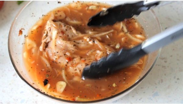 Сделаем маринад для куриных грудок. Смешиваем все специи, мед, винный уксус, 3 зубчика чеснока и заливаем пивом. Пиво лучше взять нефильтрованное. Кладем в маринад куриные грудки и ставим в холодильник на ночь.