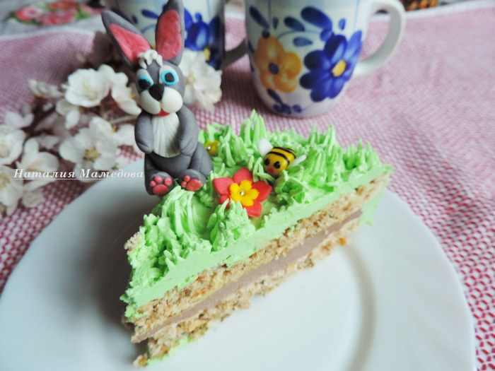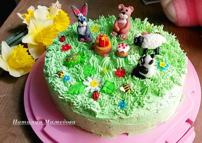 Ювелирный в даном рецепте- это, безусловно, оформительный этап. У меня лепка зверюшек заняла времени столько же, сколько и сам процесс непосредственной готовки торта. А работа над мелочевкой: пчелки и божьи коровки, -вообще требует ювелирной точности и аккуратности.