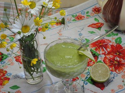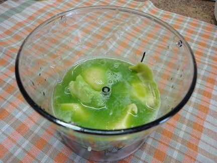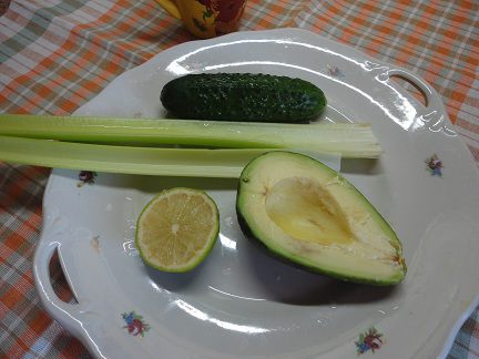Из огурца и сельдерея с помощью соковыжималки выдавить сок. В блендер поместить мякоть половинки авокадо, вылить сок овощей и лайма. Пюрировать.