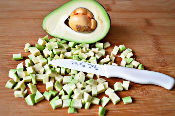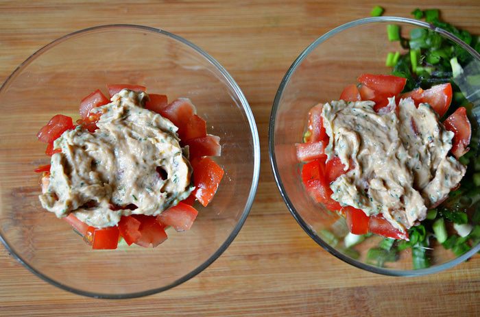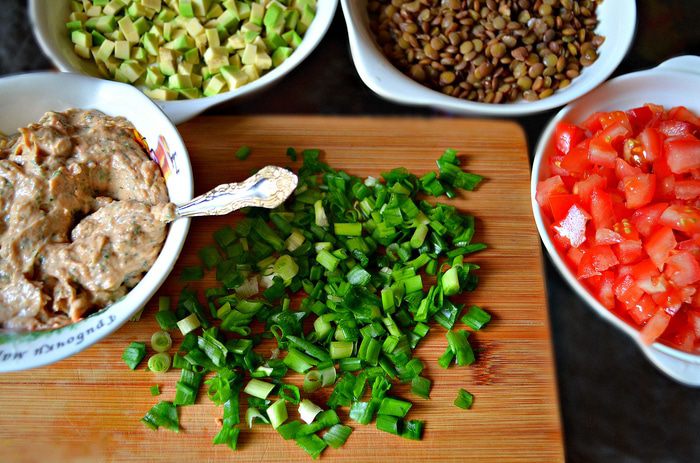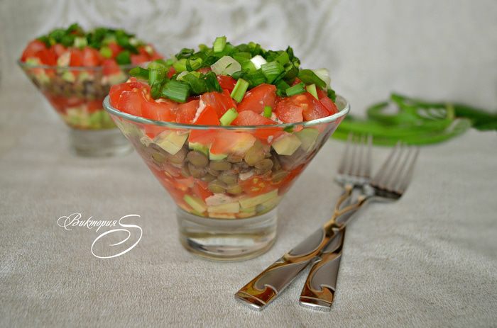 В салатник положить в произвольном порядке нарезанные томаты, авокадо, чечевицу, каждый слой промазывая соусом. Соус получается достаточно густым. Для более жидкой консистенции - можно немного уменьшить количество форели и увеличить количество йогурта.