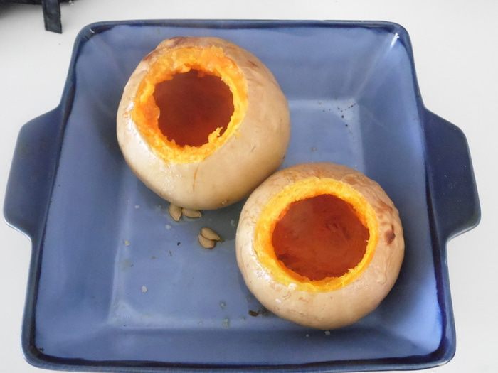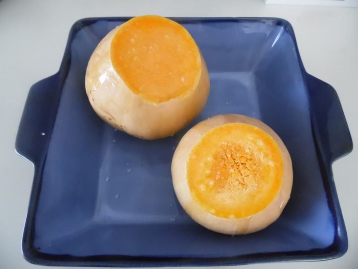 1.Тыкву помыть, отрезать верхнюю часть, полить оливковым маслом и посолить. Запечь в духовке 200С 25 мин.